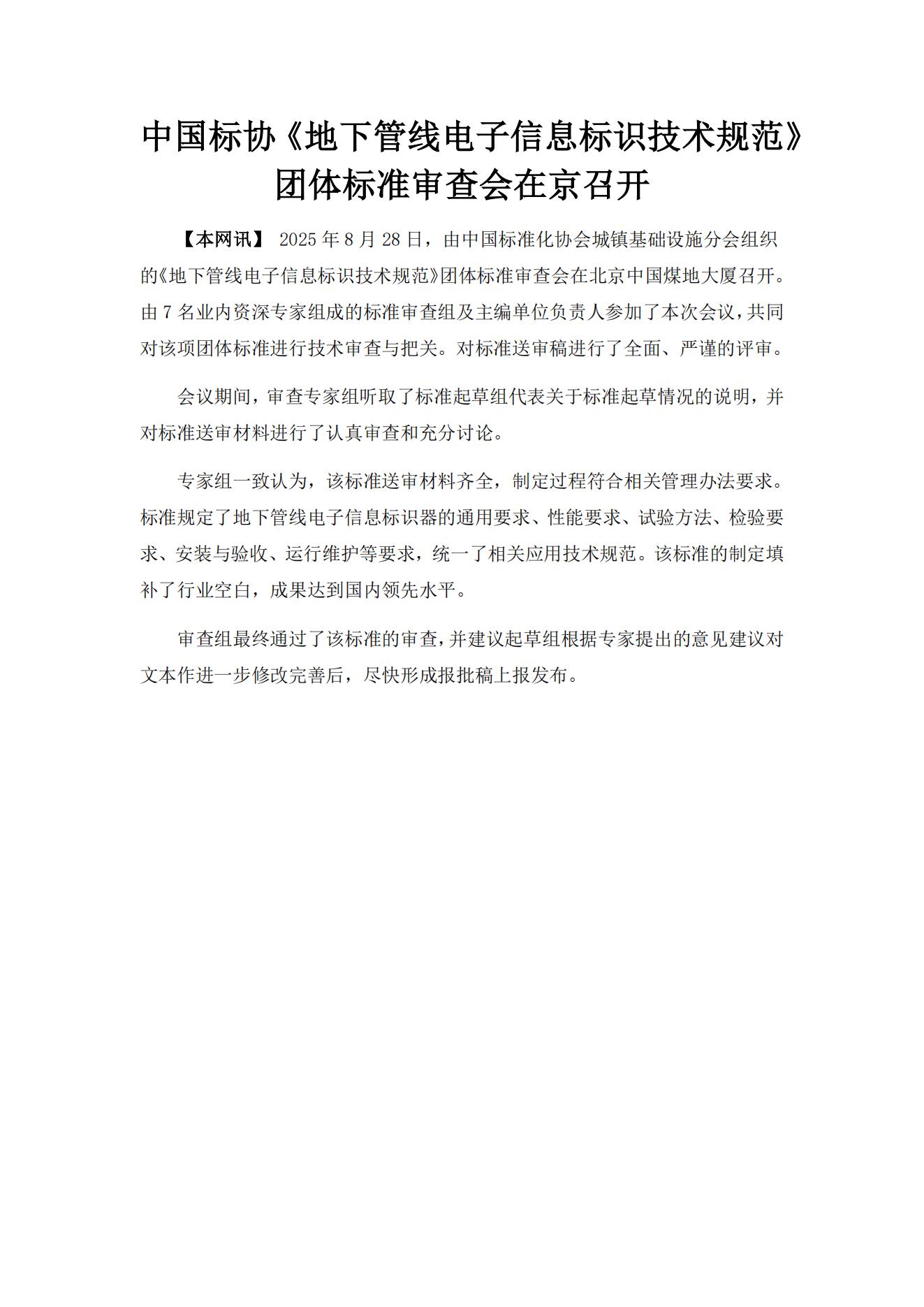中国标协《地下管线电子信息标识技术规范》团体标准审查会在京召开